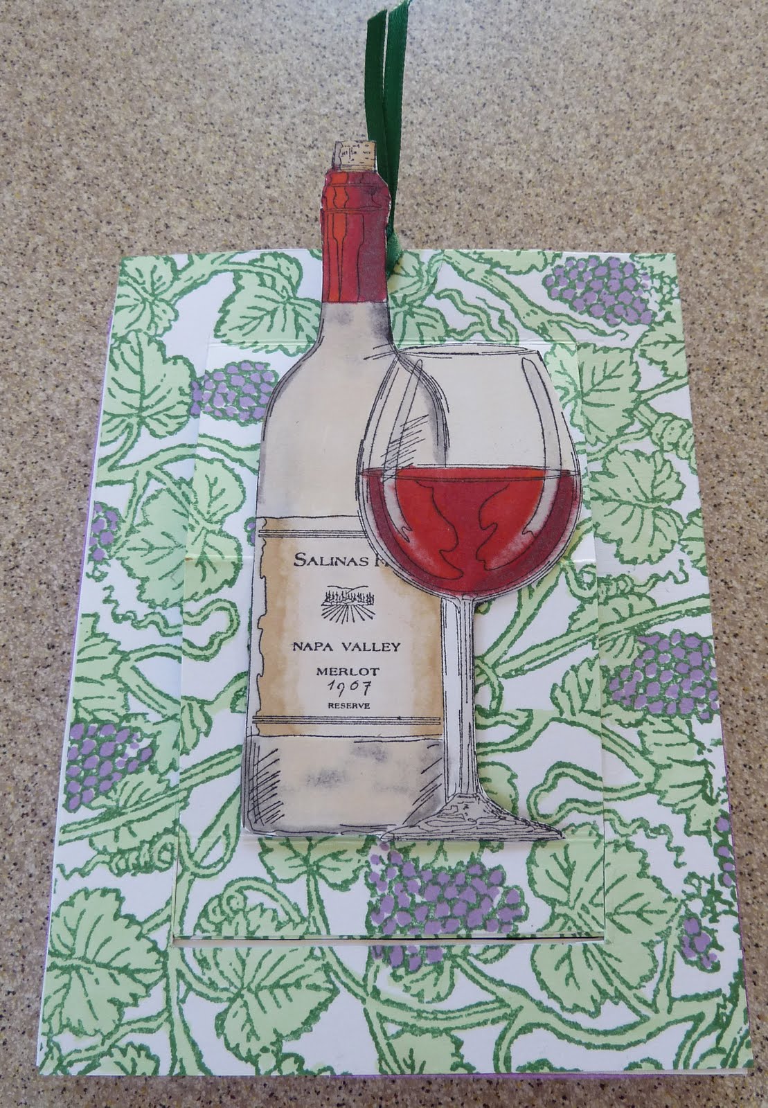 I used a background stamp from the Stamp Man for the grapevine and coloured it in using Promarkers and the glass and bottle is a stamp from Stamps Happen and again coloured with Promarkers. The sentiment inside the box is from Hobby Art.